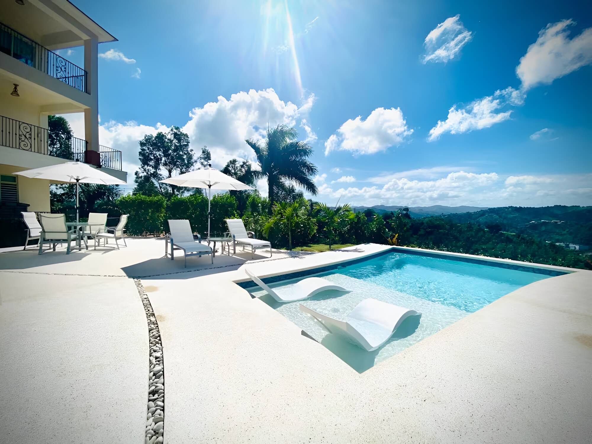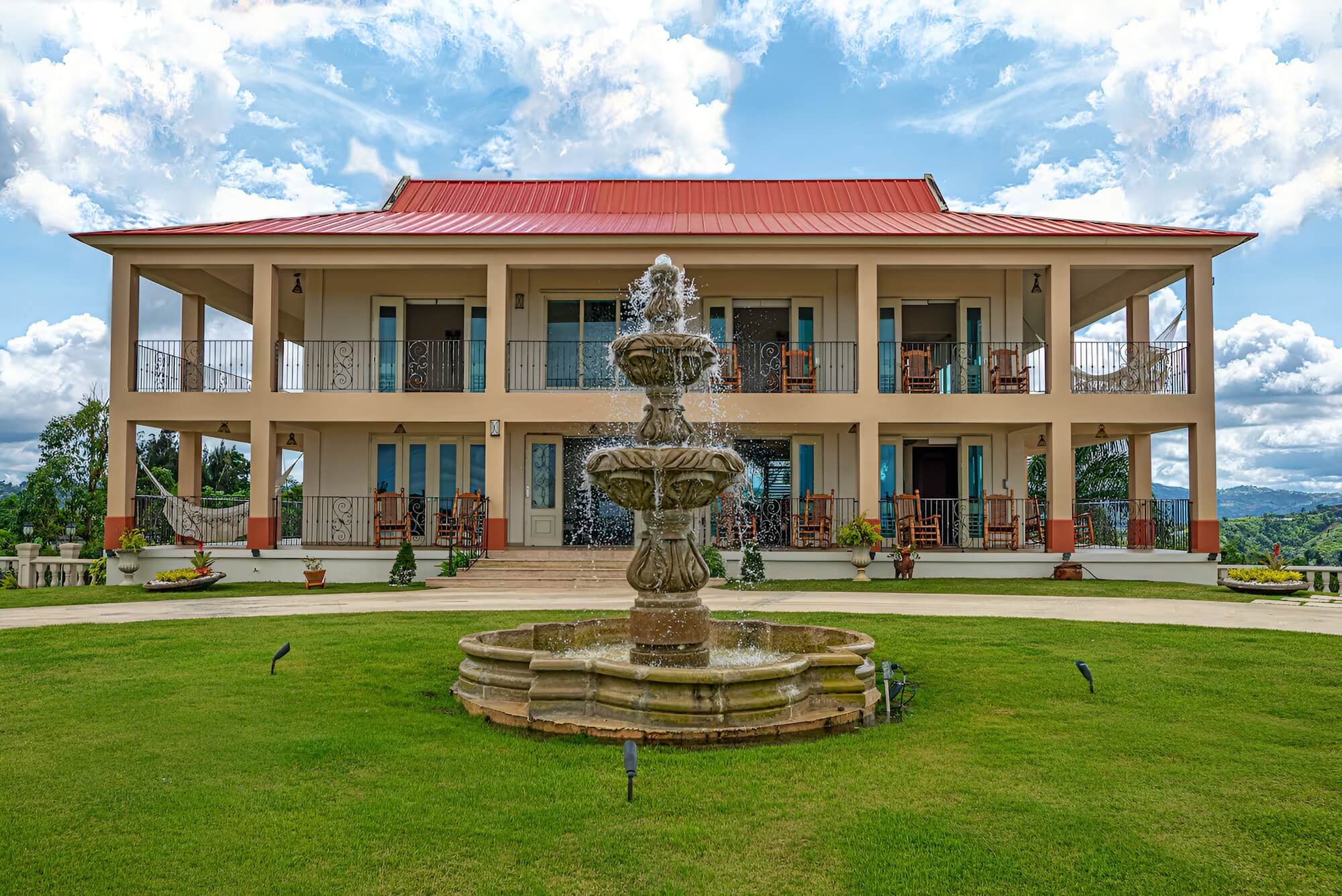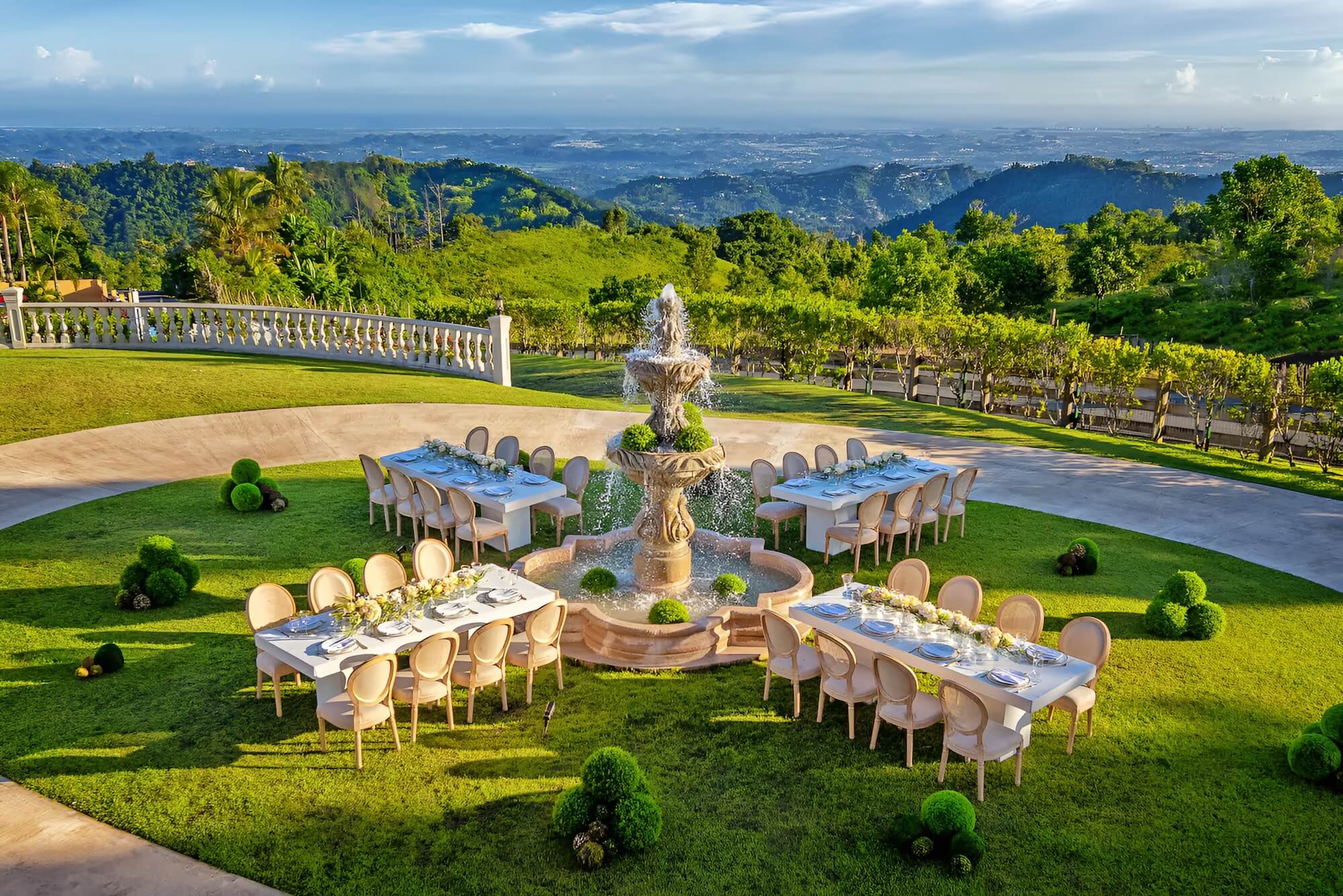 The villa has that stately hacienda style that makes the photos look like they're straight out of a magazine. Spacious balconies, elevated terraces with open mountain views, manicured gardens with fountains as focal points. Every corner is designed to look its best, meaning less investment in decoration to achieve the same impact.