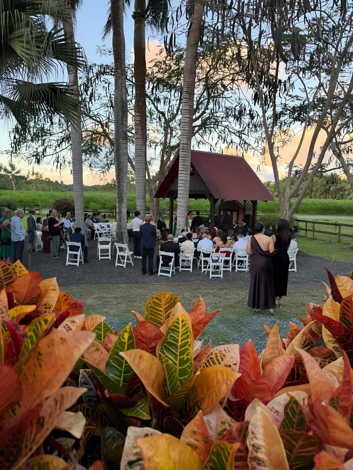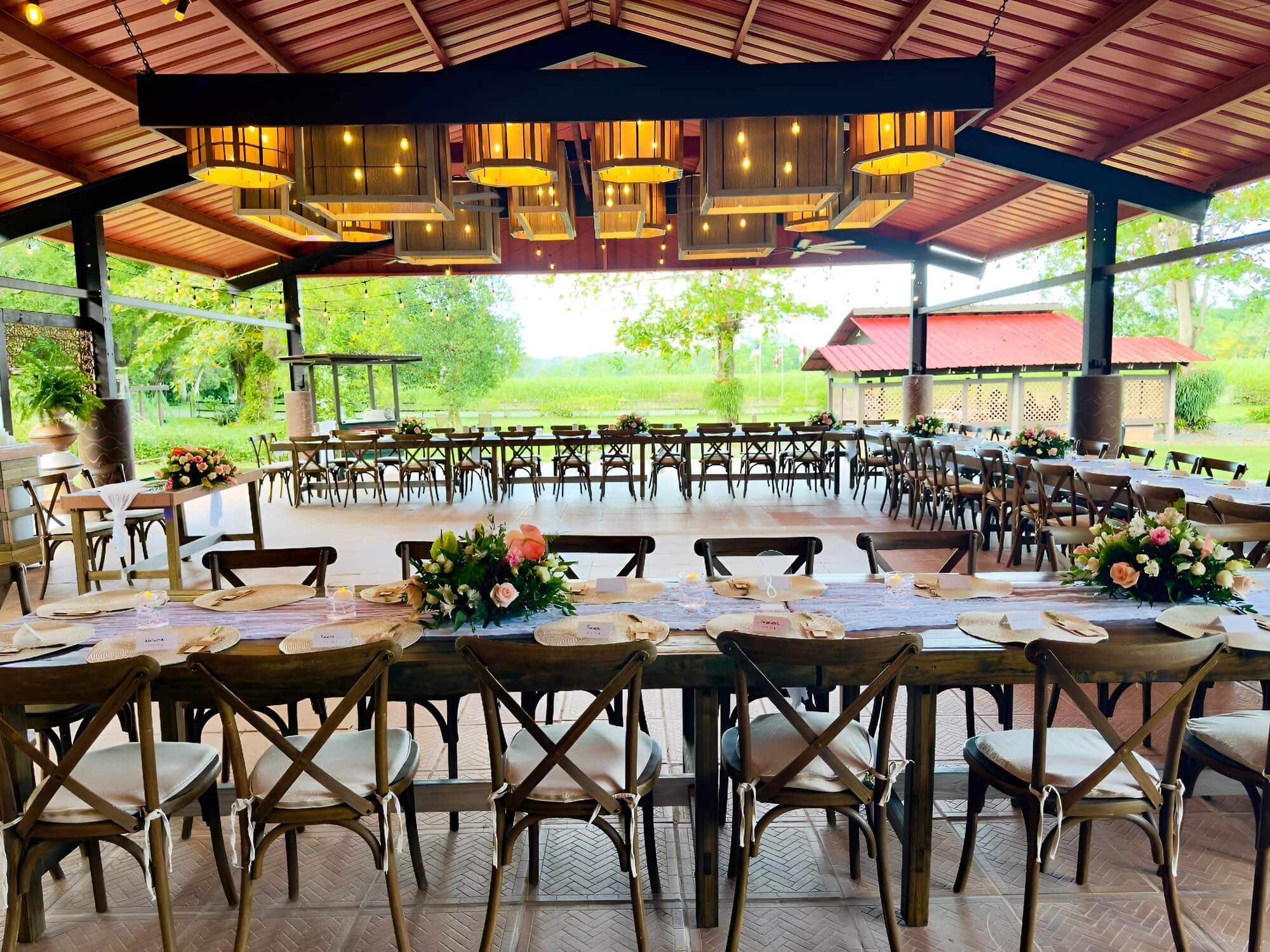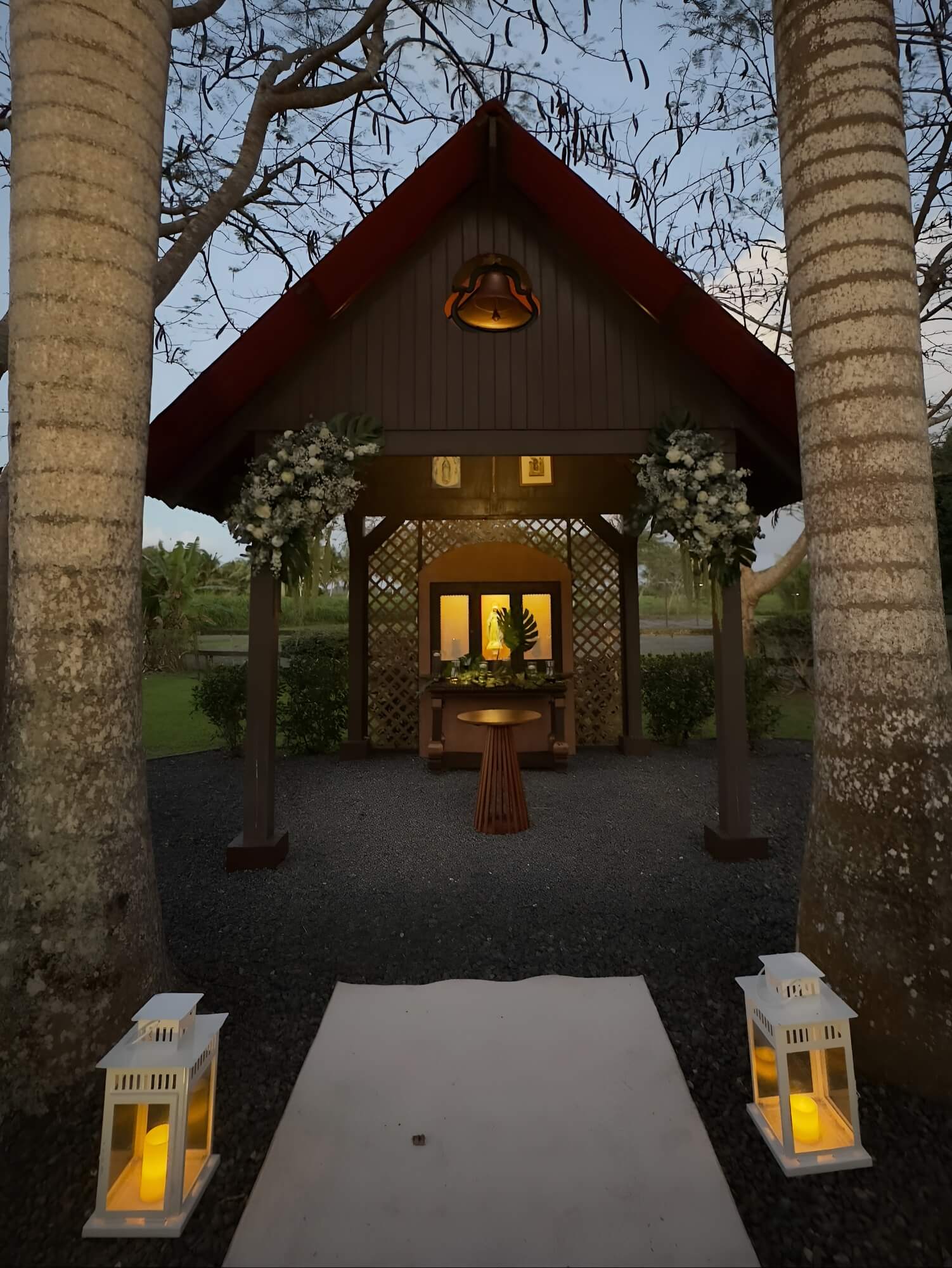 La hacienda cuenta con una estructura de madera tipo capilla rodeada de palmas y vegetación, creada para ceremonias íntimas con ese encanto rústico puertorriqueño. Los senderos naturales y el verde constante hacen que cada foto tenga ese fondo orgánico que no necesita mucha decoración adicional.